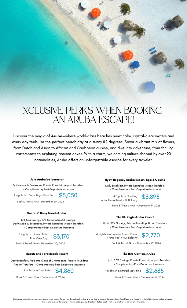 This is where world-class beaches meet calm, crystal-clear waters and every day feels like the perfect beach day at a sunny 82 degrees. Savor a vibrant mix of flavors, from Dutch and Asian to African and Caribbean cuisine, and dive into adventure, from thrilling watersports to exploring ancient caves. With a warm, welcoming culture shaped by over 90 nationalities, Aruba offers an unforgettable escape for every traveler.